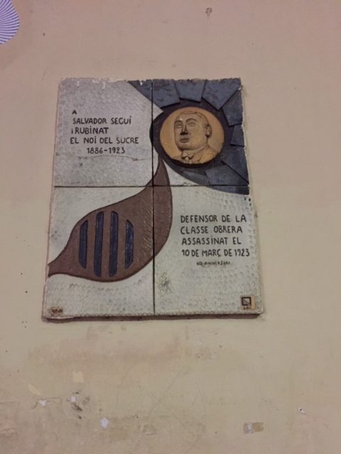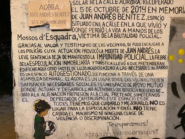 Le lendemain nous retrouvons Manel Aisa. Avec lui nous marchons dans le quartier du Raval (anciennement « quartier chinois ») où tant d’anarchistes ont laissé leur marque. Sur certaines façades on découvre des plaques expliquant qu’ici a vécu Teresa Claramunt (Sabadell 1862 – Barcelone 1931) « travailleuse du textile et anarcho-syndicaliste » ; que là a été assassiné le 10 mars 1923, Salvador Seguí, El noi del sucre, qui fut secrétaire de la CNT ; ou que sur cette place se trouvait la prison de la Reine Amalia, geôle de femmes où les conditions d’hygiène étaient déplorable et dont les détenues furent libérées le 19 juillet 1936, puis le bâtiment démoli à l’initiative des Mujeres Libres. Manel connaît aussi des lieux qui n’ont pas de plaque, comme le bâtiment où a vécu Manuel Escorza del Val. Il nous fait découvrir l’Agora Juan Andrés Benítez (Séville 1962- Barcelone 2013), un espace autogéré qui porte le nom d’un militant de la cause LGBT victime de la violence policière dans cette rue où il vivait. Le terrain occupé maintenant depuis plus de dix ans était promis à la spéculation qui gangrène tout Barcelone, mais les habitant.es en ont décidé autrement et ont créé un lieu qui répond à leurs besoins. Quand nous y sommes passés un groupe de jeunes préparait un repas végan pour les personnes présentes.